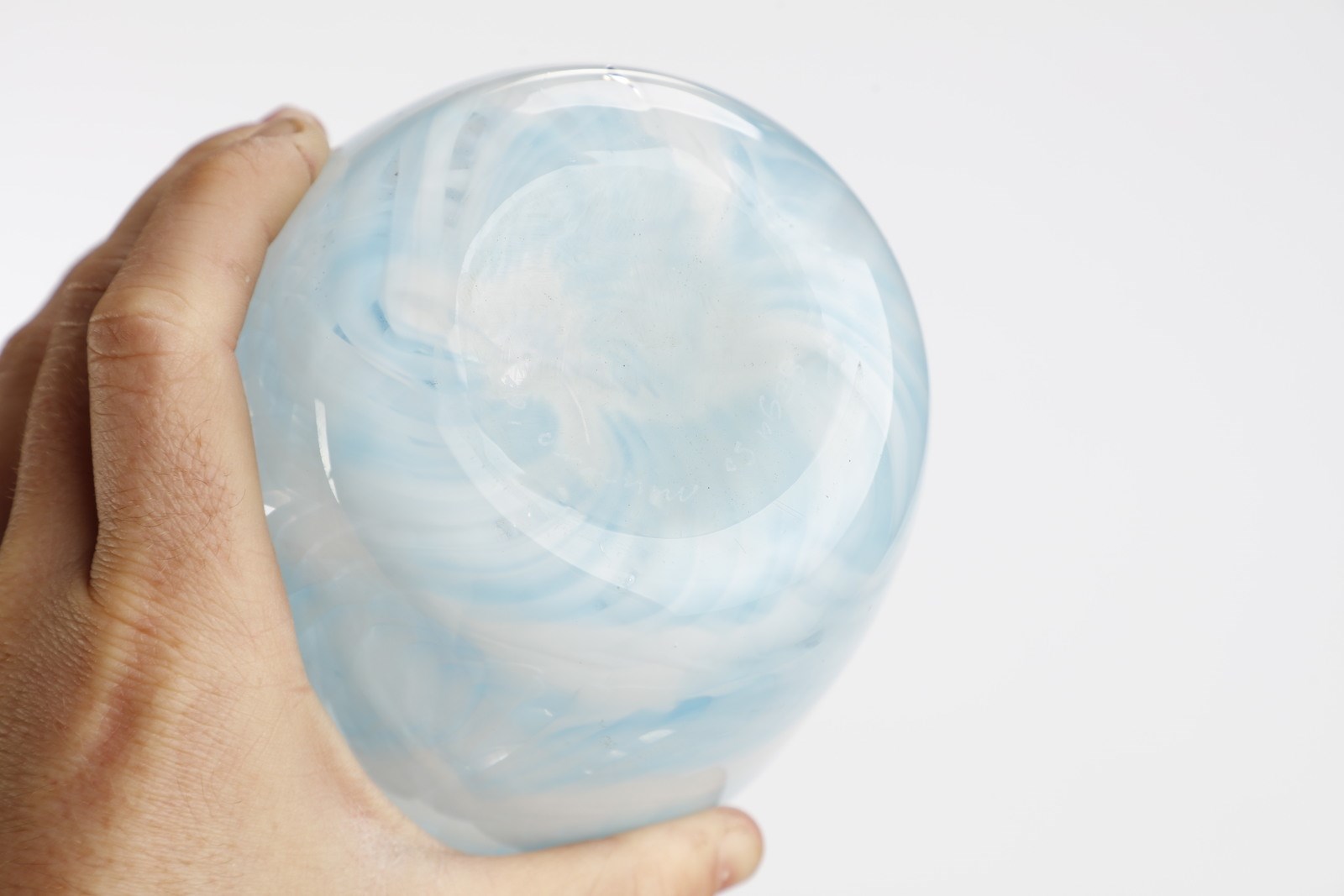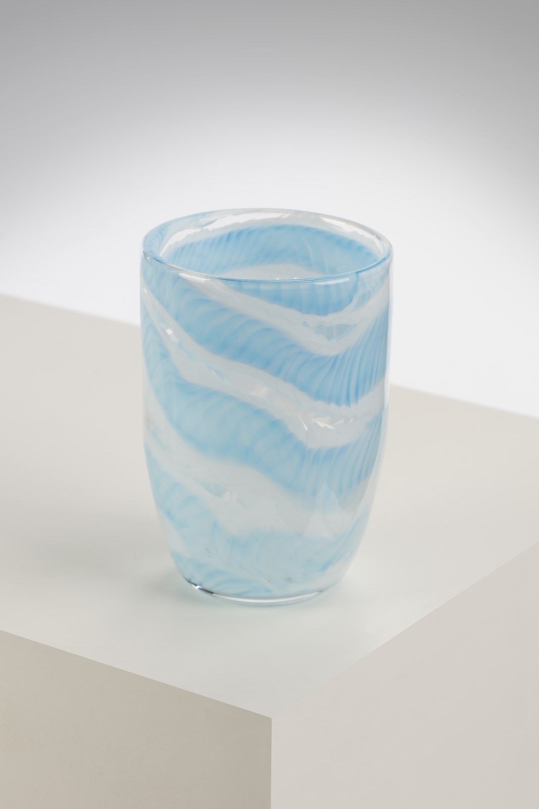 Vaso trasparente lattimo decorato con fascia a spirale azzurrina