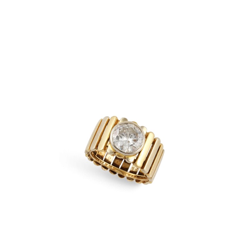 in oro giallo e bianco, fascia a barrette orizzontali con al centro diamante di 1,60 ct ca., gr. 7,4. Misura 9,5