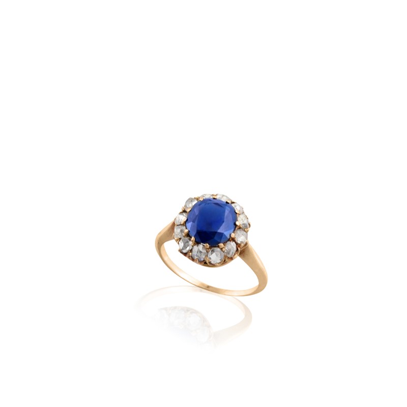 in oro giallo con zaffiro centrale del peso di 1,90 ct ca., diamanti taglio a rosa ad ornamento, gr. 3,3. Misura 12