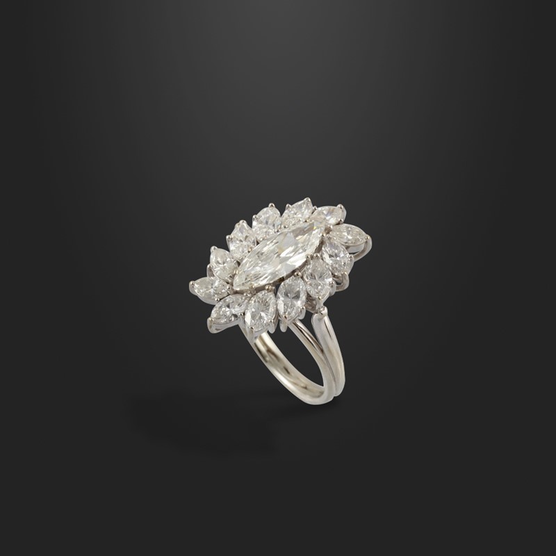 in oro bianco con diamante centrale taglio navette del peso di 1,33 ct, diamanti ad ornamento del peso di 2,40 ct ca., 7,3. Misura 16 Analisi gemmologica n. 52903 – 08-07-2022 rilasciata dal laboratorio IGI (Milano)