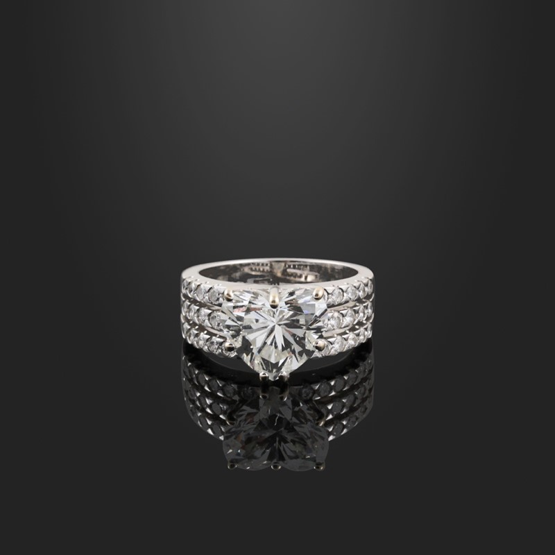 in oro bianco a fascia con piccoli brillanti. Diamante centrale taglio a cuore del peso di 5,08 ct, gr. 10,8. Misura 16 Allegata analisi gemmologica n. n. 11506433 – 03-04-2001 rilasciata dal laboratorio GIA (USA)