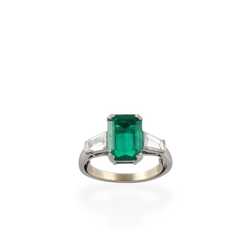in platino con smeraldo centrale a forma rettangolare con angoli tronchi del peso complessivo di 2,68 ct ca., affiancato da due diamanti taglio taper del peso di 0,90 ct ca., gr. 6,3. Misura 14