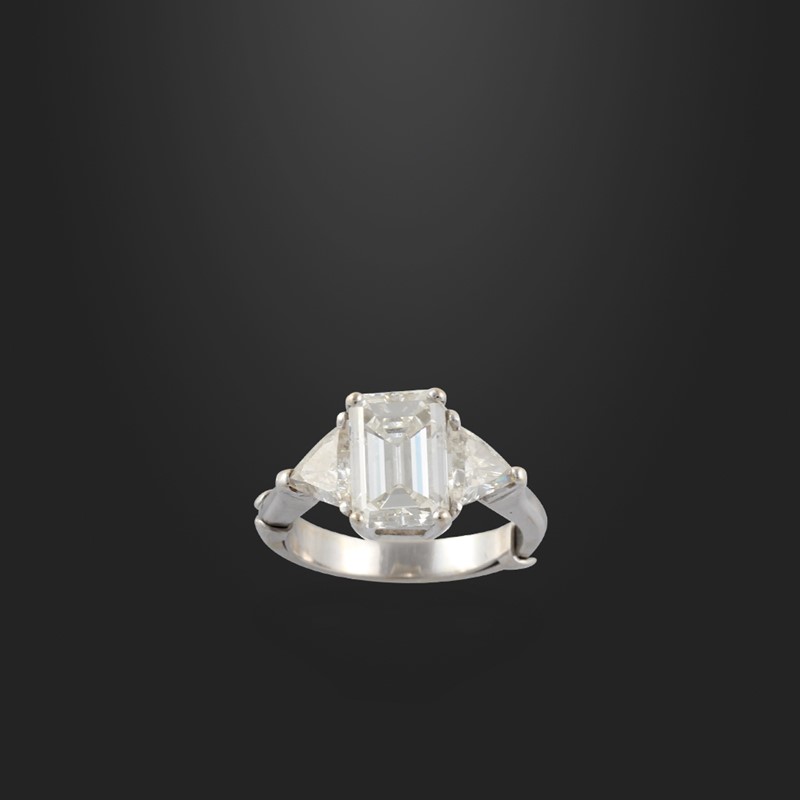 in platino con diamante centrale a forma rettangolare con angoli tronchi del peso complessivo di 3,03 ct ca., affiancato da due diamanti taglio trillion, gr. 6,5. Misura 14 Allegata analisi gemmologica n. 52902 – 08-07-2022 rilasciata dal laboratorio IGI di Milano