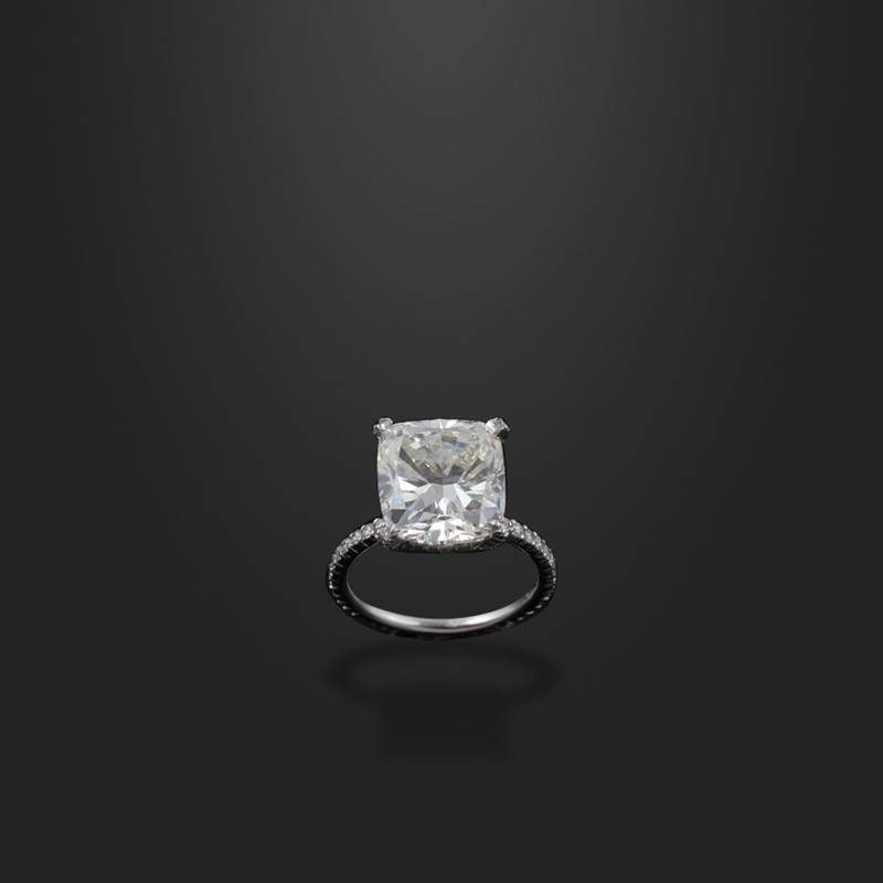 in oro bianco con al centro diamante taglio a cuscino del peso di 6,04 ct. Piccoli brillanti ornano la struttura, gr. 3,5. Misura 9 Allegata analisi gemmologica n. 14667502 – 21-10-2015 rilasciata dal laboratorio GIA (USA)