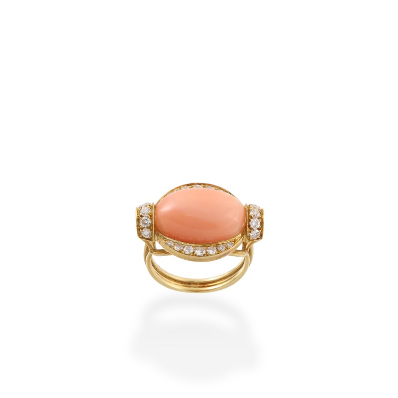 in oro giallo con corallo cabochon centrale, brillanti a contorno del peso di 0,80 ct ca., gr. 8,6. Misura 16