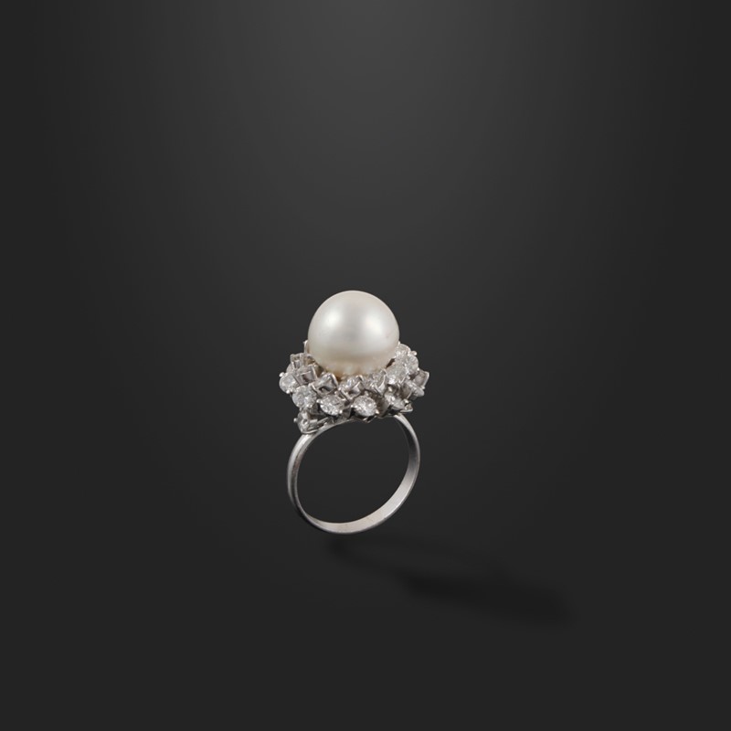 in oro bianco con al centro perla coltivata South Sea 12 mm con brillanti ad ornamento del peso complessivo di 2,60 ct ca., gr. 9. Misura 15,5
