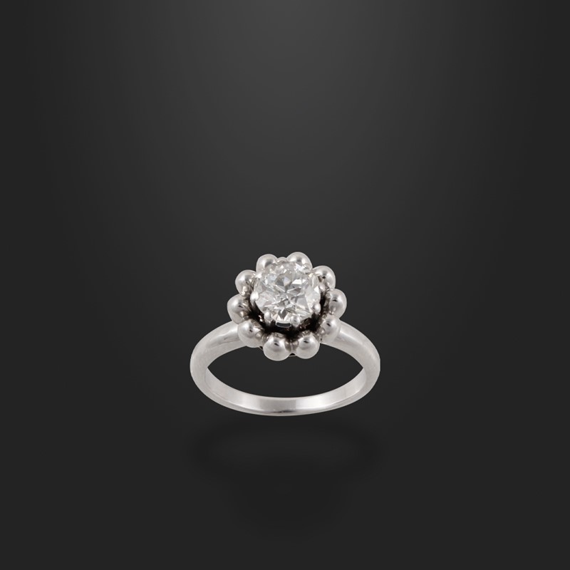 in oro bianco con al centro diamante taglio antico europeo del peso di 1,18 ct ca., inclusioni affioranti, gr. 6,5. Misura 11