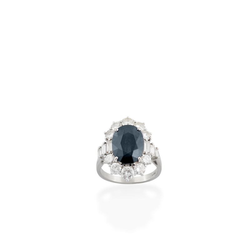 in oro bianco con zaffiro centrale del peso di 5,00 ct ca., pavè di brillanti del peso complessivo di 1,90 ct ca. e diamanti taglio baguette laterali del peso complessivo di 0,60 ct ca., gr. 6,8. Misura 16