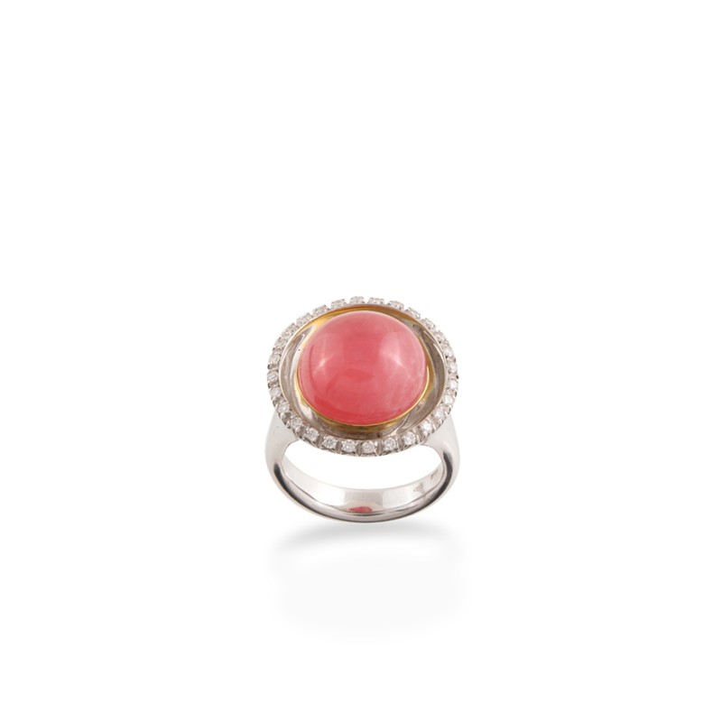in oro giallo e bianco con rodonite cabochon e brillanti, gr. 20. Misura 16