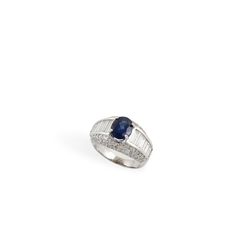 in oro bianco a fascia con diamanti baguettes laterali peso di 0,50 ct ca. e zaffiro ovale centrale del peso di 1,70 ct ca., gr. 6,4. Misura 8,5