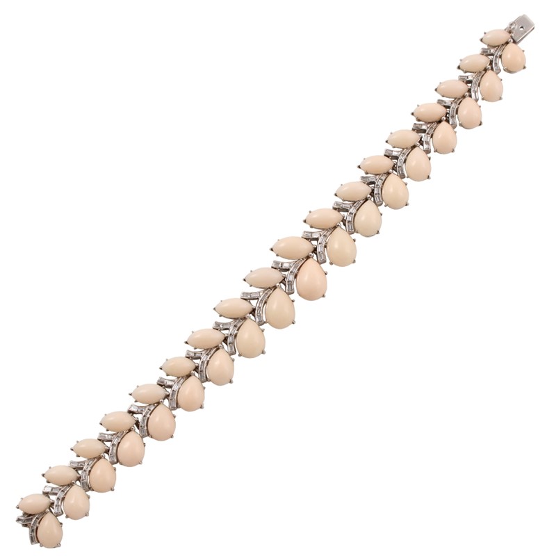 in oro bianco con corallo rosa cabochon a forma di goccia e diamanti taglio baguette, gr. 38,7. Lunghezza 18,5 cm