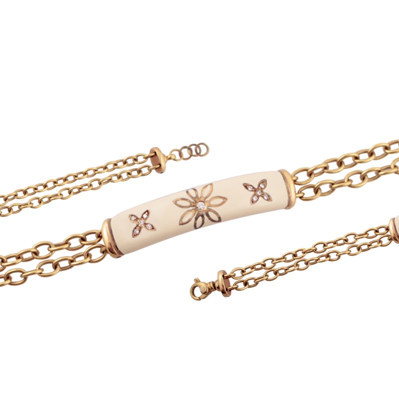 in argento e oro giallo, doppia catena con elemento centrale in smalto beige e decori con brillanti, gr. 15,3.