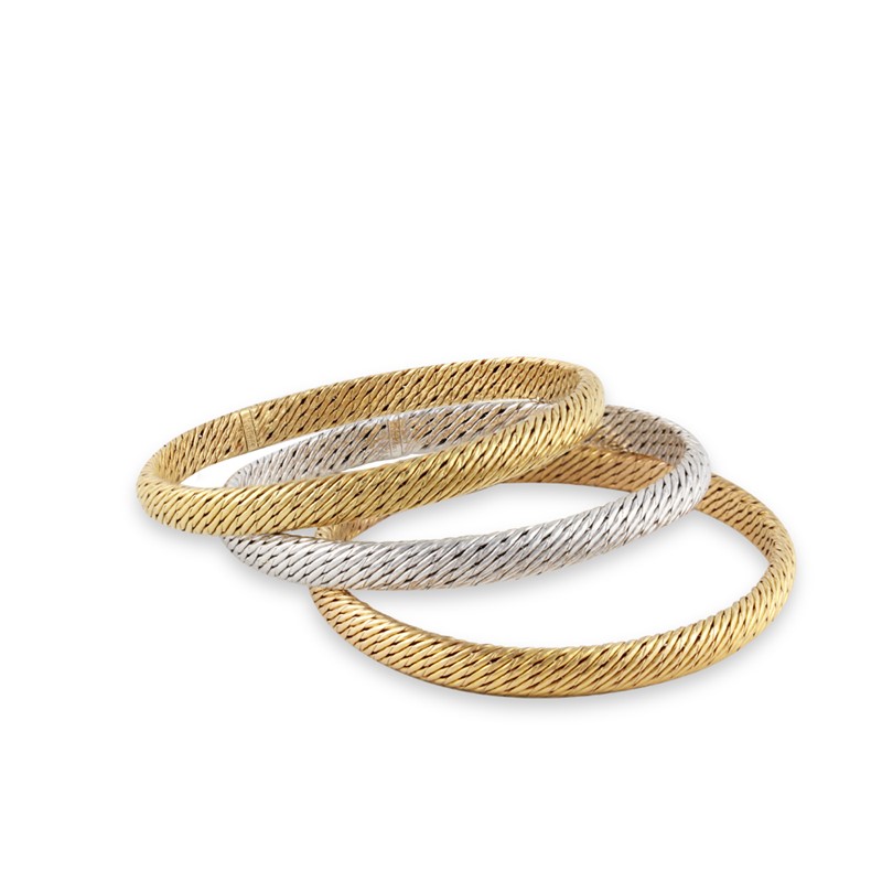 tre bracciali rigidi a torchon in oro giallo e bianco, piccola mancanza, gr. 91,2. Numero di matricola: E 2246 Z1, E 2246 R1, E 2246 R2 Firmati: Van Cleef & Arpels