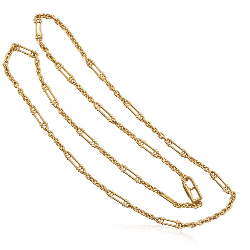 in oro giallo ad anelli alternati a maglie stilizzate aperte, gr. 71,4. Lunghezza 84 cm Firmata: Pomellato