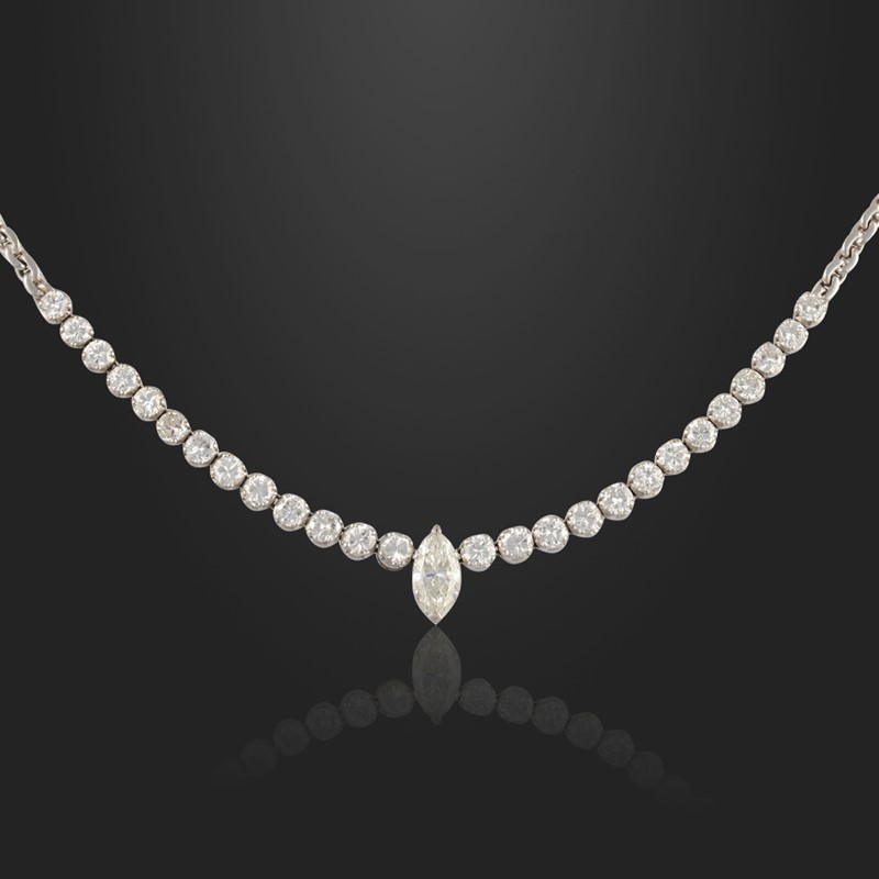 girocollo in oro bianco con diamante taglio navette centrale del peso di 1,80 ct ca., rivière parziale di brillanti a scalare, prosegue maglia marina con chiusura. Brillanti rimanenti del peso complessivo di 7,00 ct ca., gr. 27,7. Lunghezza 42,5 cm