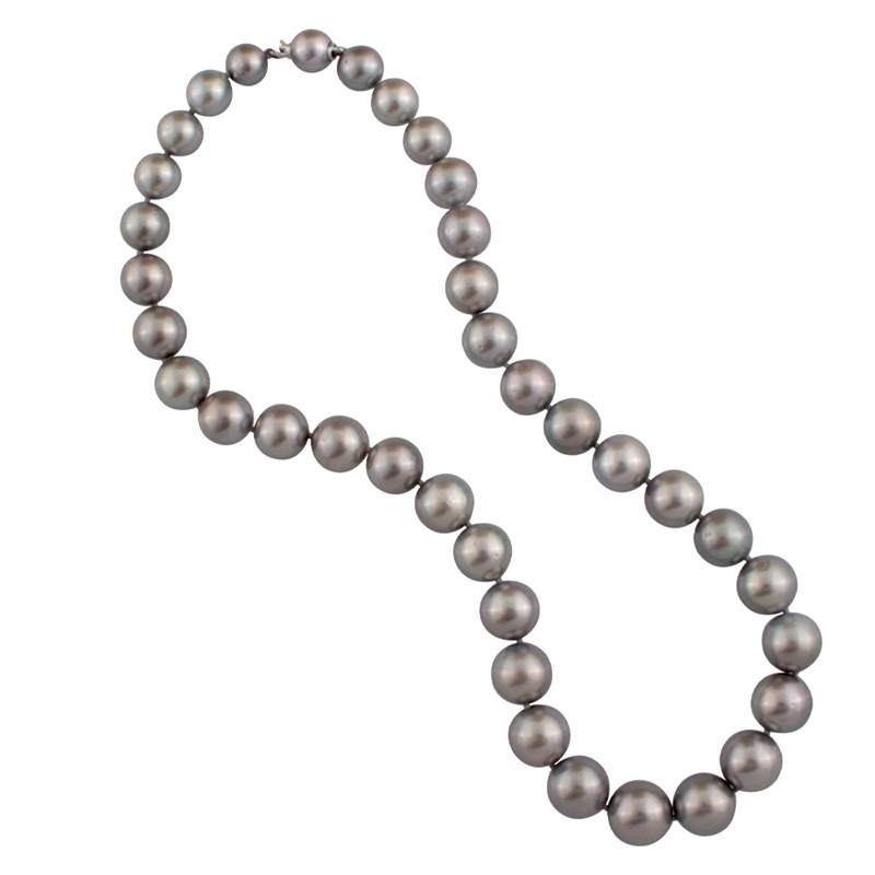 di perle coltivate South Sea “Tahiti” a scalare, diametro 9,5/13,5 mm, con chiusura in oro bianco, gr. 86 ca. Lunghezza 45 cm