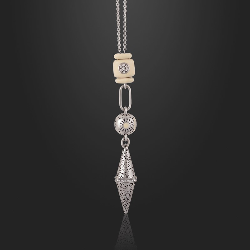 catena in oro bianco e lucchetto in smalto beige da cui pendono sfera e coni sovrapposti traforati con brillanti, gr. 28,6.