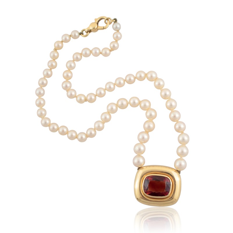 un filo di perle coltivate, con al centro quarzo madera a forma ovale montato in oro giallo, gr. 38,1.