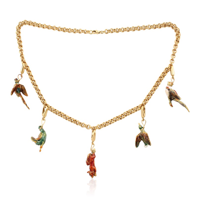 in oro giallo a maglie doppie con ciondoli raffiguranti animali con smalti policromi, gr. 108,4. Lunghezza 54,5 cm Numerario: 10 MI (Micheletto Emilio & F. di Olivo Micheletto – Milano)