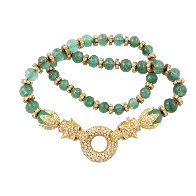 girocollo con sfere di smeraldo a scalare alternate a rondelle in oro giallo con piccoli brillanti, chiusura raffigurante due teste di pantera unite da anello circolare con pavè di brillanti, occhi con piccoli rubini. Brillanti del peso complessivo di 5,30 ct ca., gr. 91,3. Lunghezza 38 cm Numerario: 1923 AL (Curti & C. – Valenza)