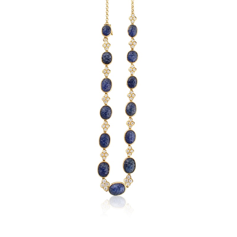 girocollo in oro giallo a elementi ovali con al centro zaffiri cabochon incisi alternati a maglie con brillanti del peso complessivo di 2,60 ct ca., gr. 42,6 Lunghezza 45 cm Firmata: Petochi - Roma