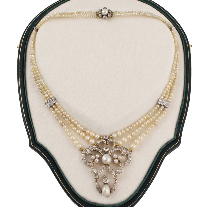 tre fili di perle a scalare alternati a elementi in oro bianco con diamanti, al centro elemento con motivo a volute, perle di dimensioni maggiori e diamanti, gr. 32,3. Corredata da custodia. Lunghezza 40,5 cm