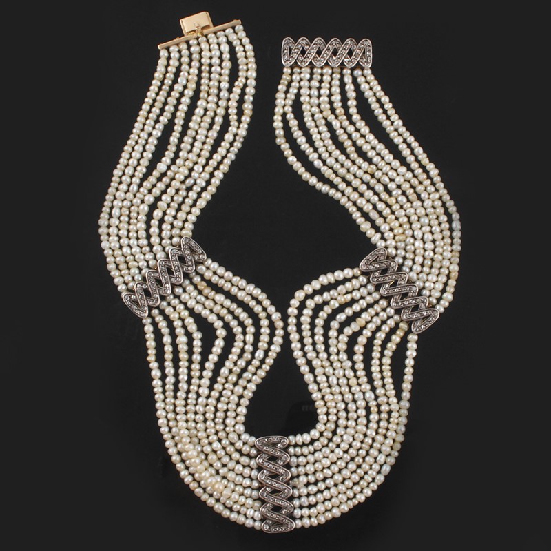 girocollo a nove fili di perle, intervallati da elementi intrecciati in oro e argento con diamanti, gr. 51,1 Lunghezza 33 cm Fine XIX Secolo