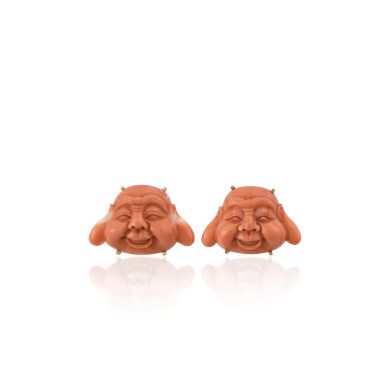 in corallo finemente inciso con figura orientale, montati in oro giallo, gr. 12,9.