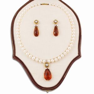 un filo di perle coltivate, con al centro quarzo madera a forma ovale montato in oro giallo, gr. 38,1.