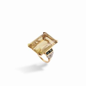 in oro giallo e platino con quarzo citrino centrale, zaffiri e brillanti ad ornamento, gr. 19,5. Misura 22 Anni [..]