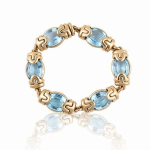 in oro giallo con topazi azzurri ovali, trattenuti da elementi a disegno geometrico, gr. 91,6. Lunghezza 18 cm