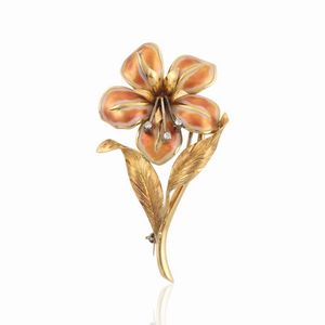 in oro e argento, a forma floreale con diamanti e smalti policromi, gr. 12,7.