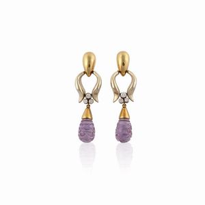 in oro giallo e bianco pendenti con brillanti e ametiste forma a goccia incise, gr. 21,1. Anni ‘50