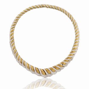 girocollo in oro giallo e bianco a elementi ondulati a scalare con pavè di brillanti alternati a cavallotti fesonati [..]