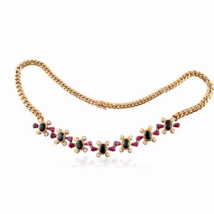 girocollo in oro giallo a elementi ovali con al centro zaffiri cabochon incisi alternati a maglie con brillanti [..]