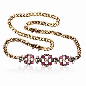 in oro giallo e argento a rosoni con rubini e diamanti, gr. 26,5. Lunghezza 37,5 cm