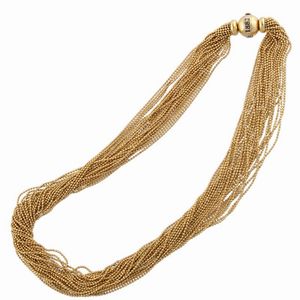 girocollo “torchon” a trenta fili in oro giallo. Chiusura in oro giallo e bianco a forma sferica, gr. 85,7. Lunghezza [..]