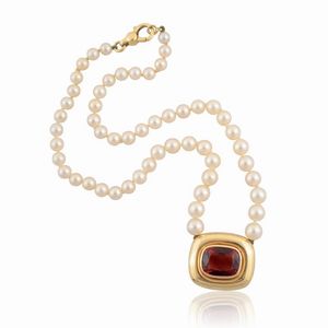 un filo di perle coltivate, con al centro quarzo madera a forma ovale montato in oro giallo, gr. 38,1.