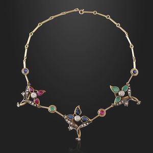 girocollo in oro giallo e argento. Parte anteriore costituita da fiori tripetali formati da smeraldi, zaffiri [..]