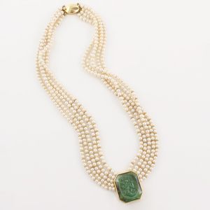 girocollo a cinque fili di perle alternate a elementi in oro giallo, grande tormalina verde centrale incisa raffigurante [..]