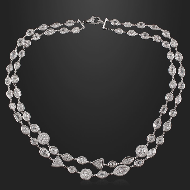 in oro bianco, doppia rivière di diamanti a forme diverse del peso complessivo di 38,00 ct ca., chiusura a moschettone con piccoli diamanti, gr. 70,6. Corredato da custodia. Lunghezza 43,5 cm