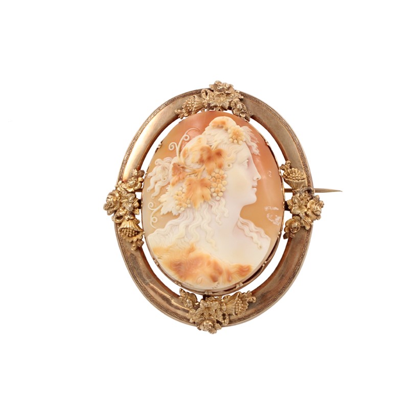 cornice in oro giallo, decorata a motivi floreali, cammeo in conchiglia con figura femminile al centro, gr. 39,5. Fine XIX Secolo