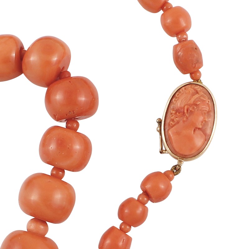 in corallo a scalare 19,2/8,3 mm, chiusura in oro giallo con cammeo, gr. 174,7. Lunghezza 85 cm