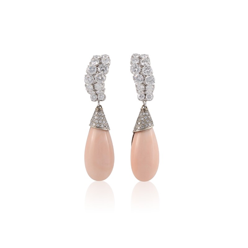 in oro bianco pendenti con corallo rosa a goccia trattenuti da doppia rivière a semicerchio di brillanti del peso complessivo di 5,60 ct ca., gr. 27,5.