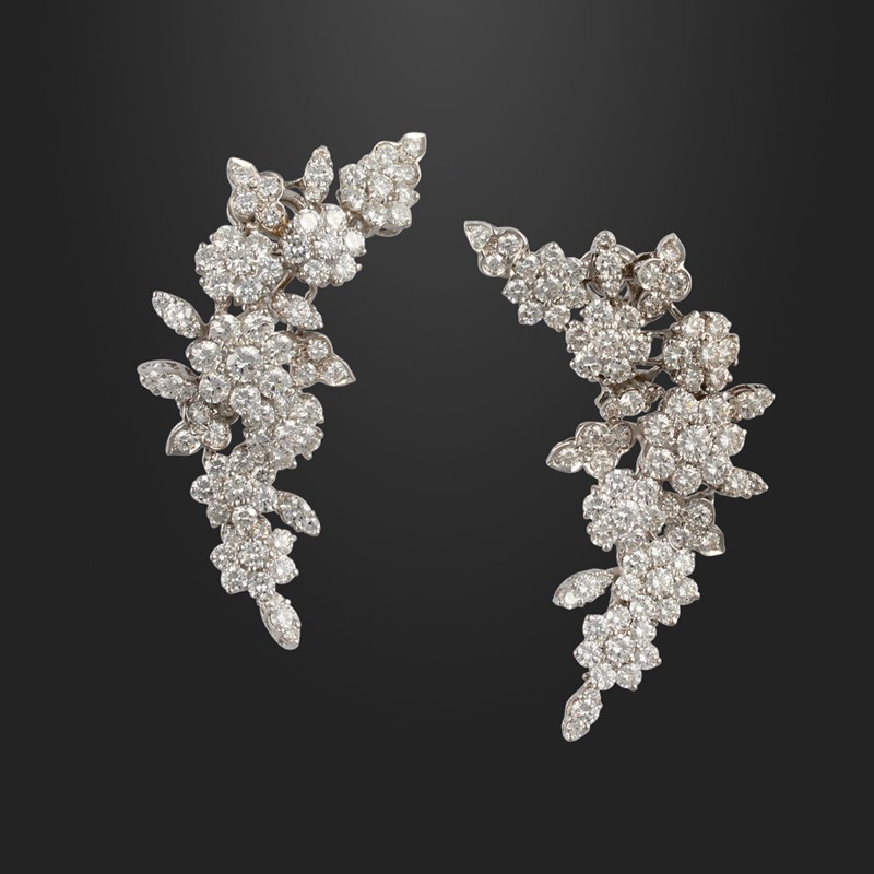 pendenti a morbido tralcio fiorito e fogliato interamente realizzati in oro giallo rodiato e brillanti del peso complessivo di 10,00 ct ca., gr. 36,4.