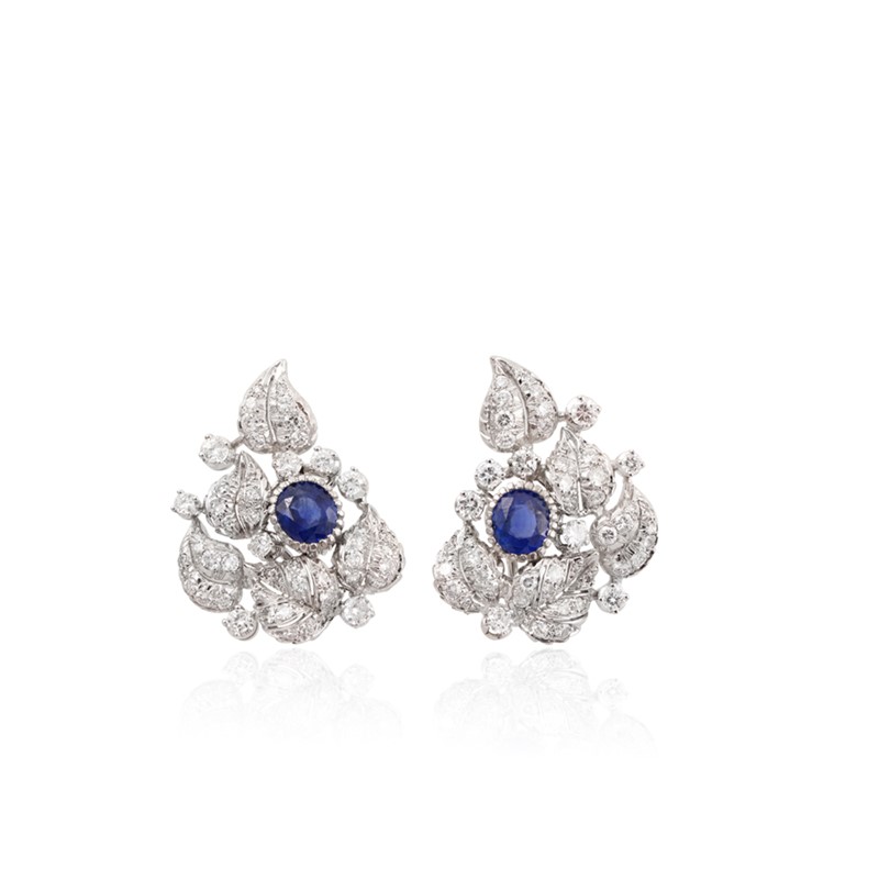 in oro bianco a motivi vegetali con zaffiri di forma ovale al centro del peso complessivo di 3,00 ct ca., brillanti a contorno del peso complessivo di 3,20 ct ca., gr. 22,9. Analisi gemmologica n. 52852 – 28-06-2022 rilasciata dal laboratorio IGI di Milano attestante che le gemme sono di provenienza Sri Lanka e non hanno subito trattamento termico