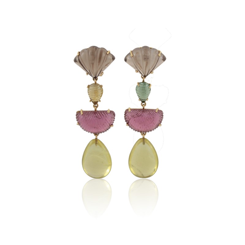 in oro giallo con tormaline e quarzi incisi, forme varie, gr. 25,8.