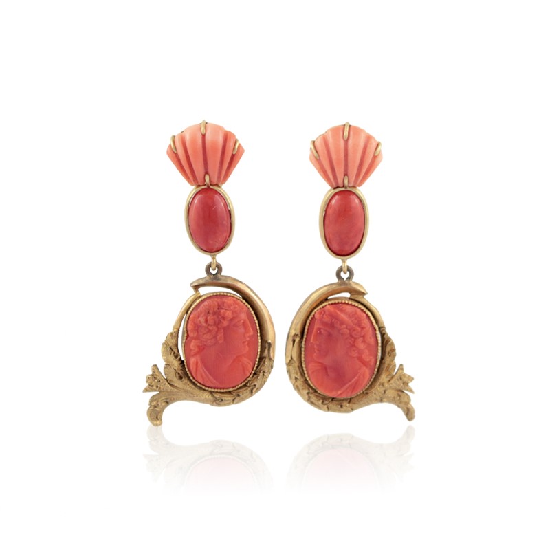 in oro giallo, con coralli taglio cabochon, incisi, i cammei in corallo sono montato in metallo dorato, gr. 23,4.