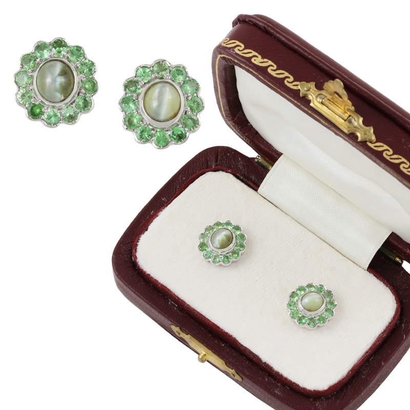 in oro bianco con crisoberillo varietà occhio di gatto (cimofane) e peridot ad ornamento, gr. 7,1. Corredati da custodia.
