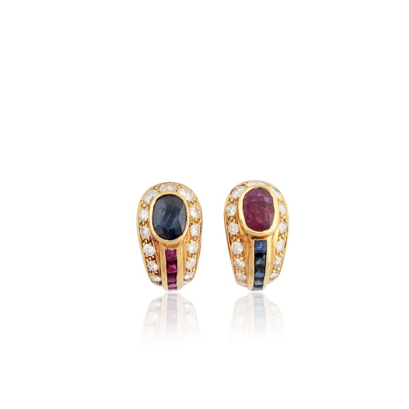 in oro giallo, con zaffiri e rubini carrè, brillanti del peso complessivo di 2,00 ct ca., rubino e zaffiro centrali del peso complessivo di 2,30 ct ca., gr. 14,3.
